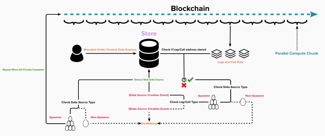from spawner contracts.- Usually, this can be accomplished with one parallel sweep of the blockchain. However, if it is the case that there is a spawner that can spawn another spawner, the blockchain may need to be processed multiple times.