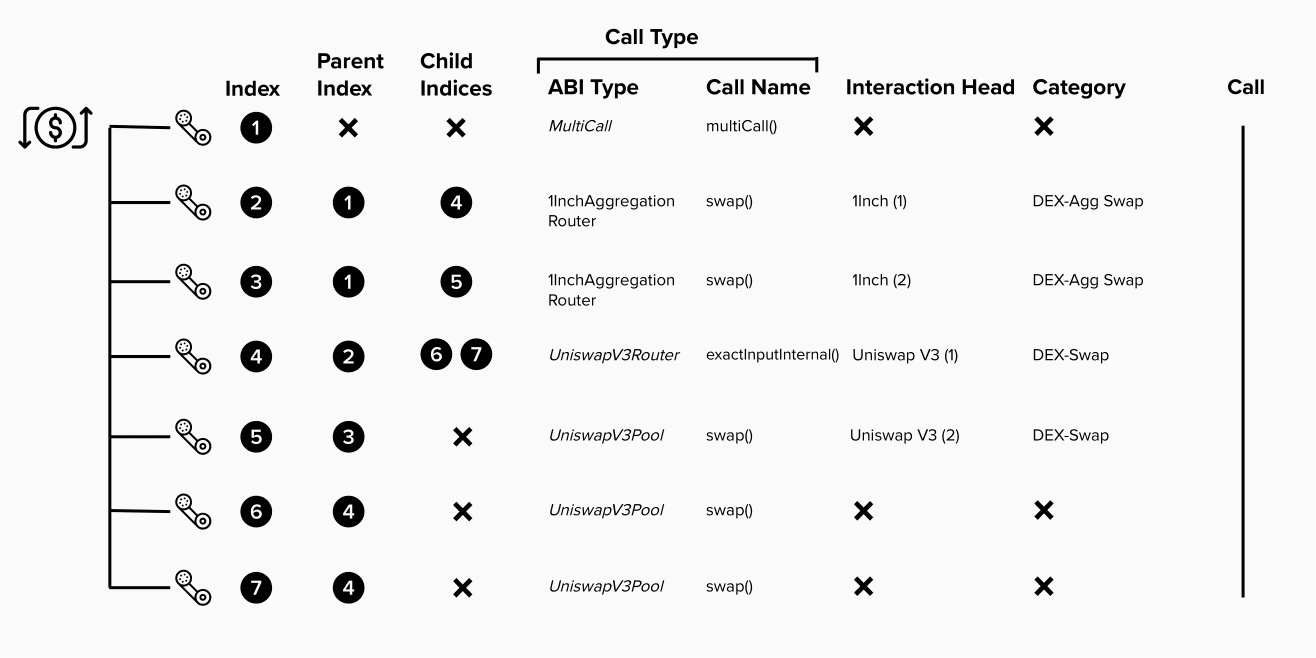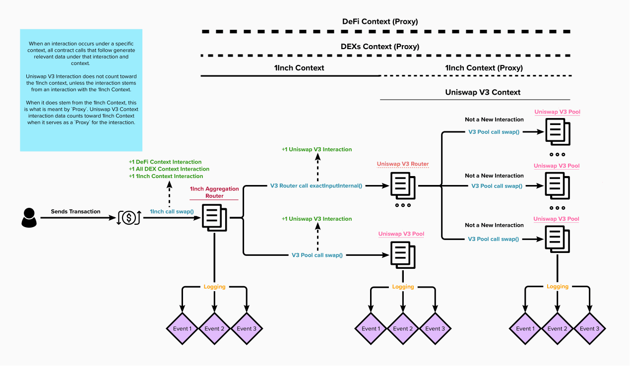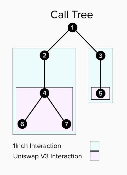 - A user executing a swap on 1Inch using the 1InchAggregationRouter might execute a swap on Uniswap V3 that swaps on 2 UniswapV3Pool contracts (liquidity pools).